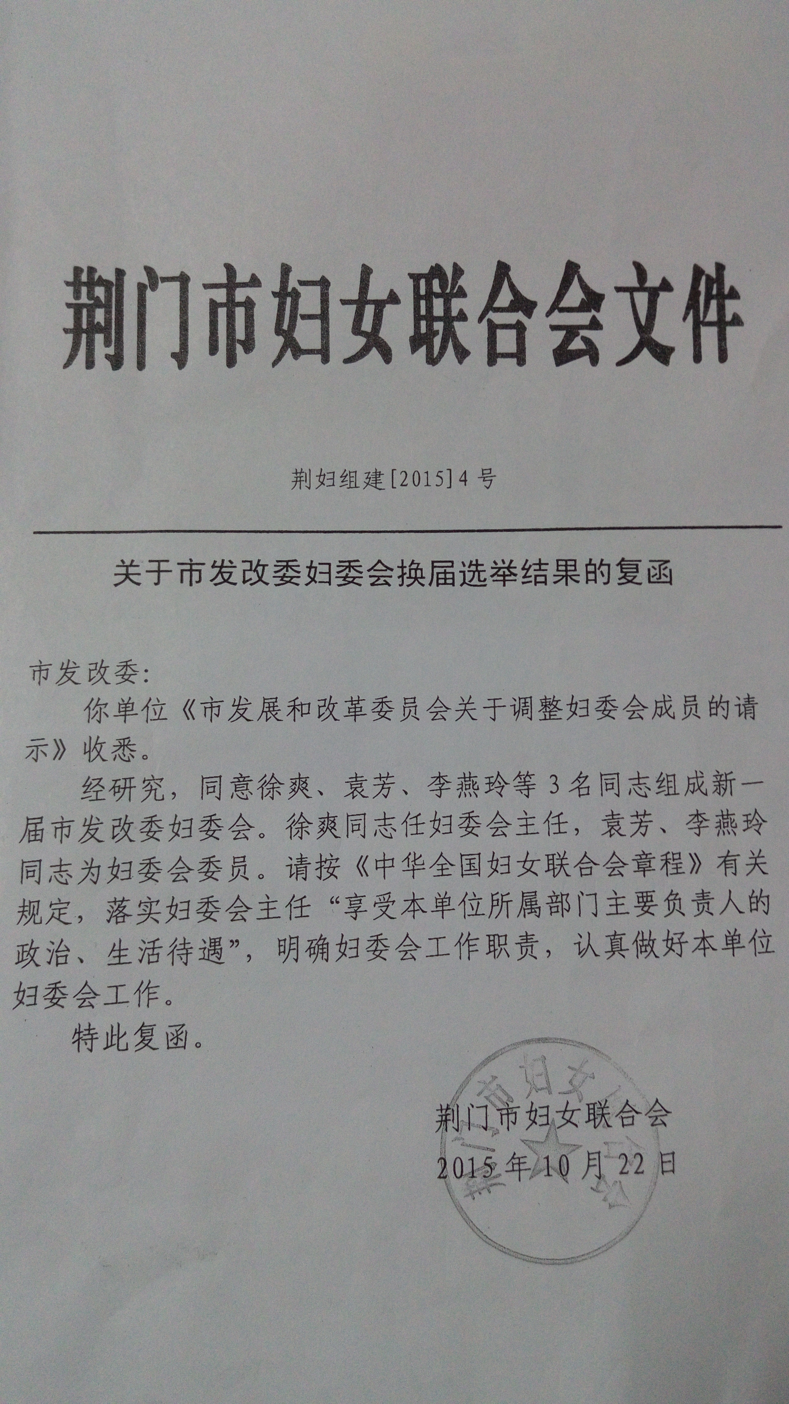 关于市发改委妇委会换届选举结果的复函
